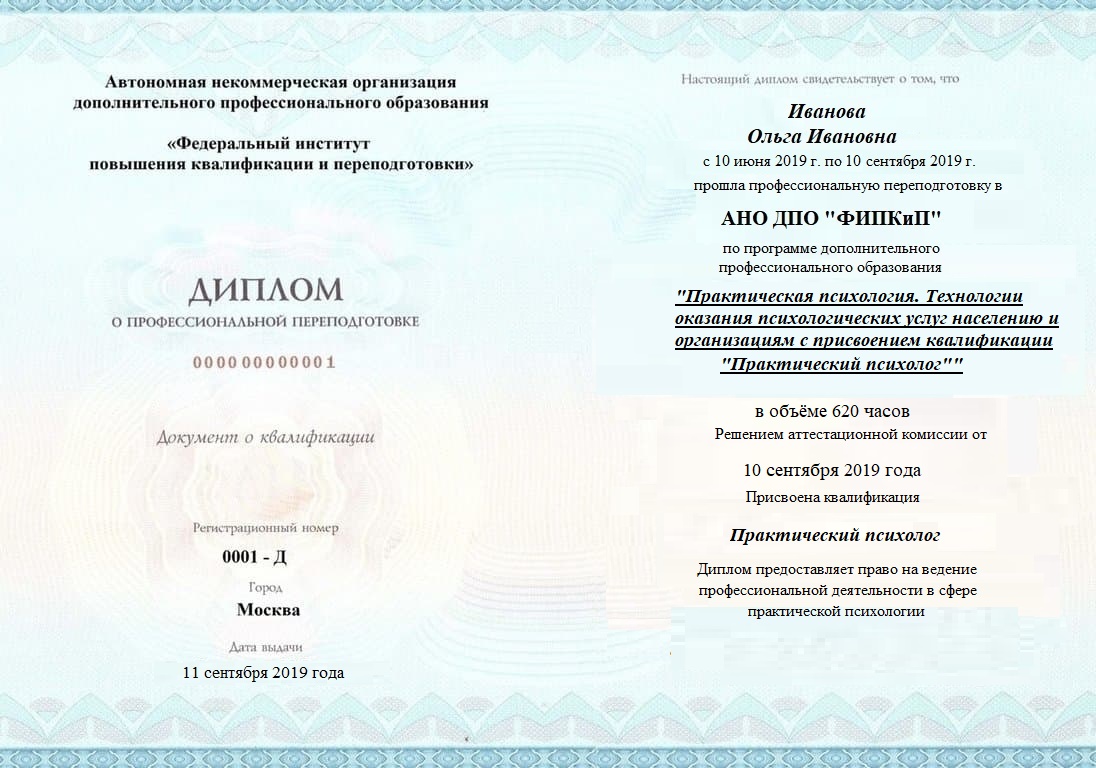 Диплом о профессиональной переподготовке, дающий право на ведение профессиональной деятельности в избранной сфере.