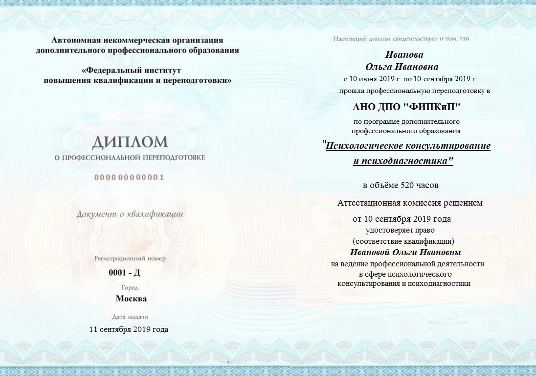 Диплом о профессиональной переподготовке, дающий право на ведение профессиональной деятельности в избранной сфере.