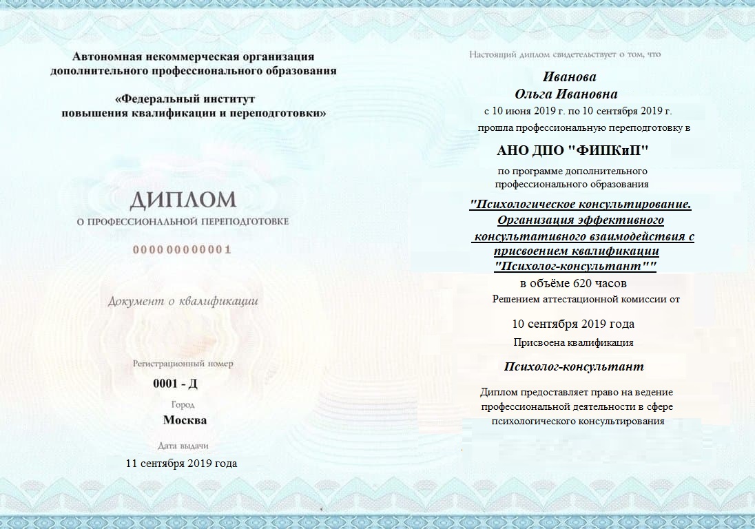 Диплом о профессиональной переподготовке, дающий право на ведение профессиональной деятельности в избранной сфере.