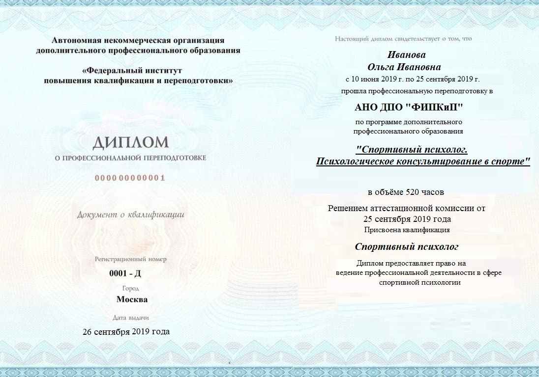 Диплом о профессиональной переподготовке, дающий право на ведение профессиональной деятельности в избранной сфере.