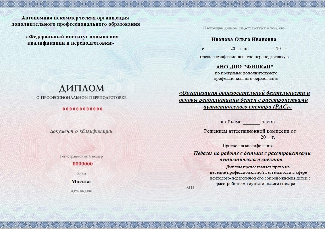 «Организация образовательной деятельности и основы реабилитации детей с расстройствами аутистического спектра (РАС)» с присвоением квалификации «Педагог по работе с детьми с расстройствами аутистического спектра»