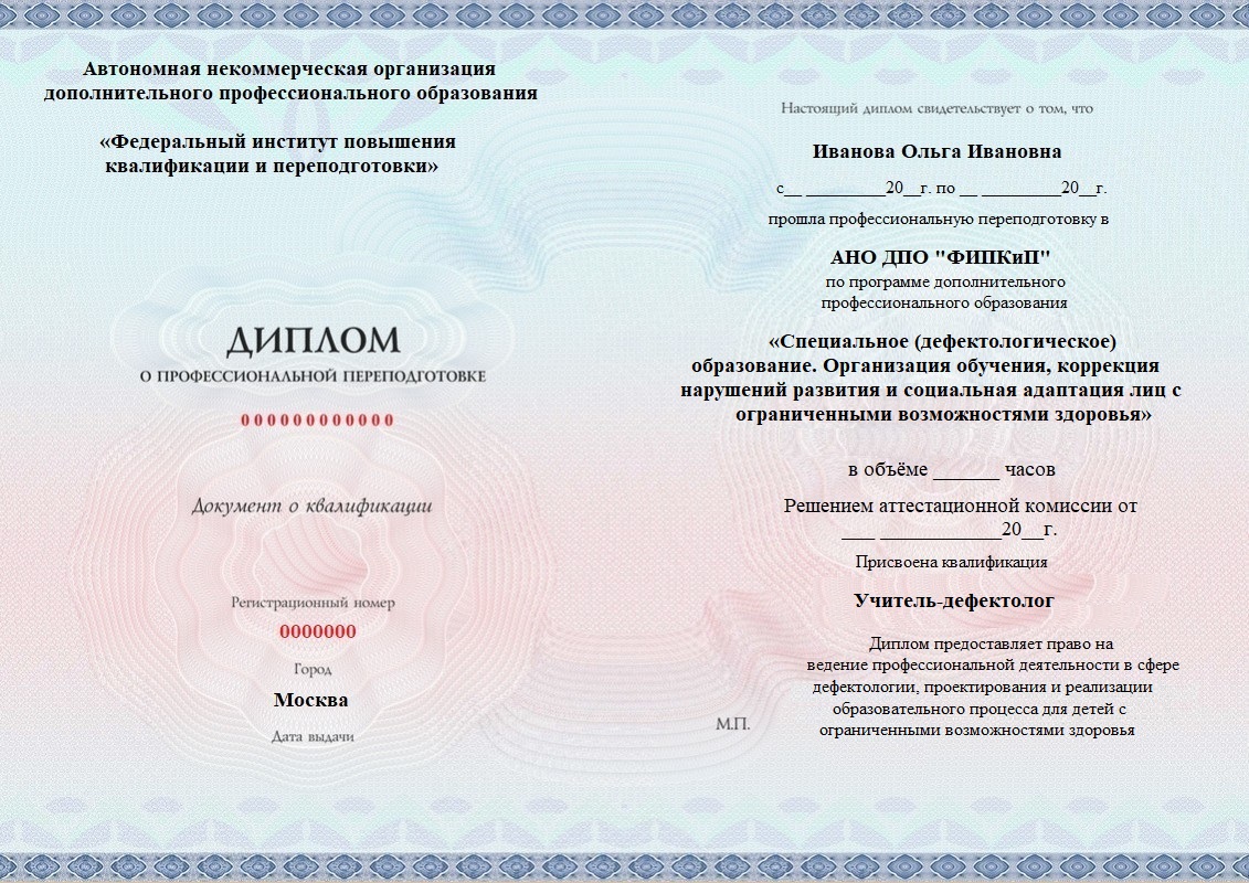 Диплом о профессиональной переподготовке, дающий право на ведение профессиональной деятельности в избранной сфере.